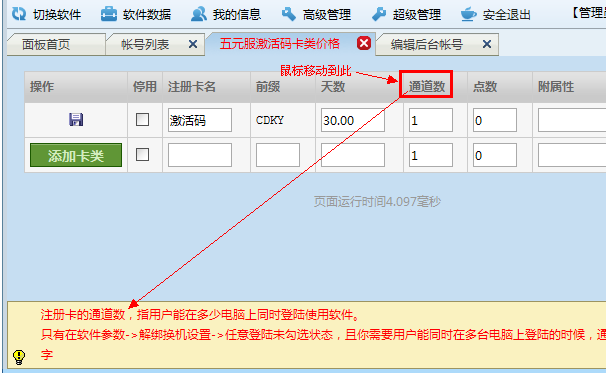 在后台,所有专业名词,页脚都有解释,方法就是鼠标移动到文字上,看页脚提示。 例如:通道数是什么意思? 鼠标移动到通道数字样上,下方会有具体的提示